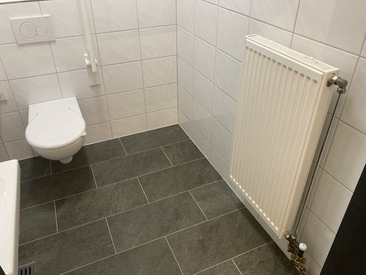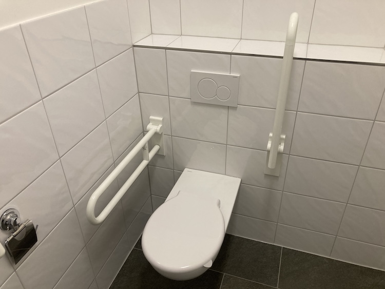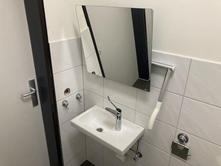 Das beheizte WC hat die Abmessungen 190 x 150 cm (rund 2,85 m²). Eine zweite Person sollte sich zeitgleich in dem WC aufhalten können. Rechts von der Toilette ist für Rollstühle bis zu einer Breite von 72 cm Platz. Der Raum ist mit einem Handtuchhalter und Seifenspender in Rollstuhlfahrer*in gerechter Höhe sowie einem Spiegel ausgestattet. Das Deckenlicht wird mittels Bewegungssensor automatisch ein-/ausgeschaltet.